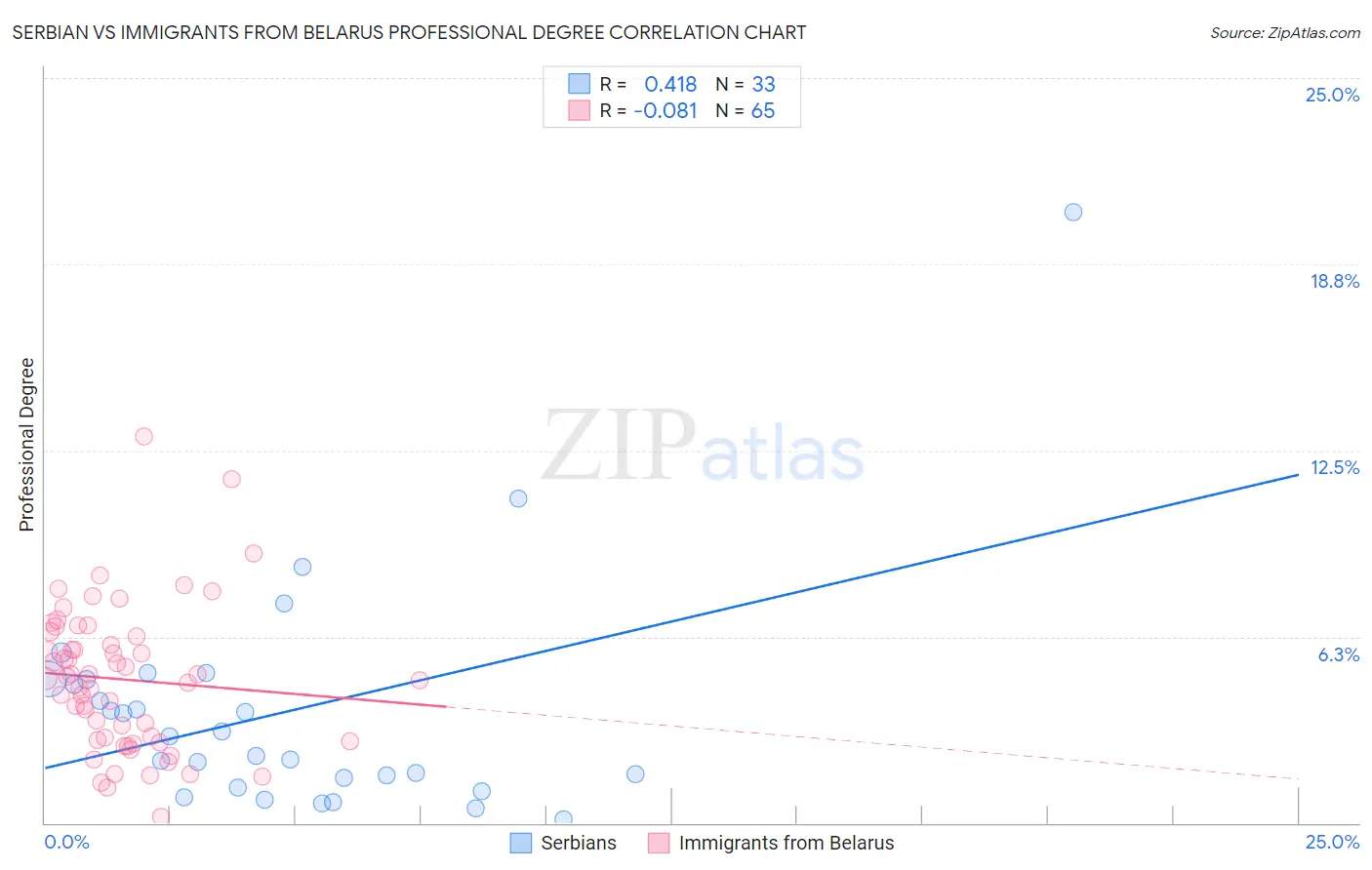 Serbian vs Immigrants from Belarus Professional Degree Correlation Chart