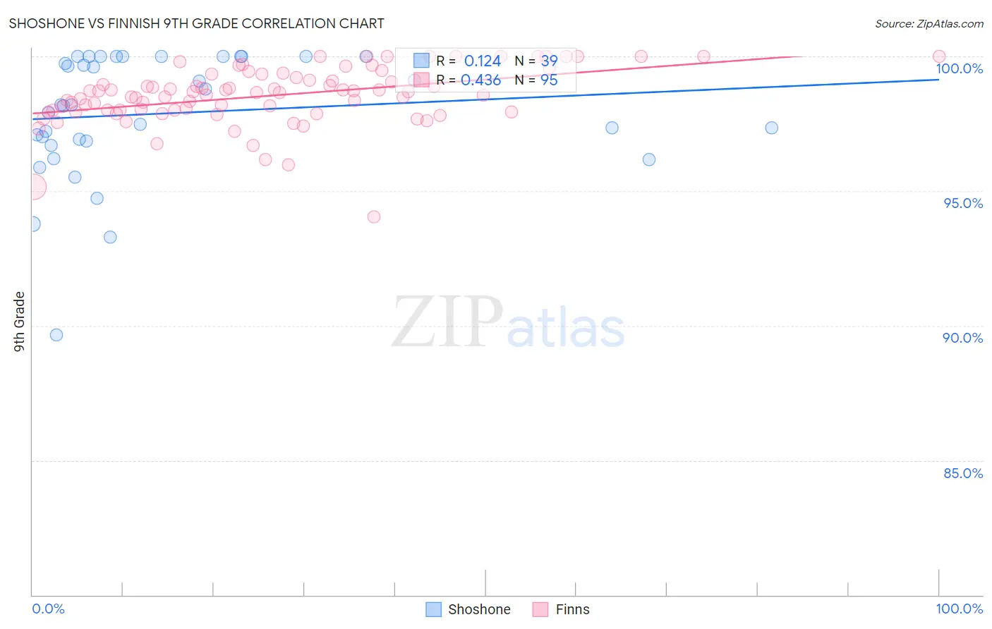 The statistical analysis conducted on geographies consisting of 66,625,086 people shows a poor positive correlation between the proportion of Shoshone and percentage of population with at least 9th grade education in the United States with a correlation coefficient (R) of 0.124 and weighted average of 95.4%. Similarly, the statistical analysis conducted on geographies consisting of 404,676,377 people shows a moderate positive correlation between the proportion of Finns and percentage of population with at least 9th grade education in the United States with a correlation coefficient (R) of 0.436 and weighted average of 96.6%, a difference of 1.3%.