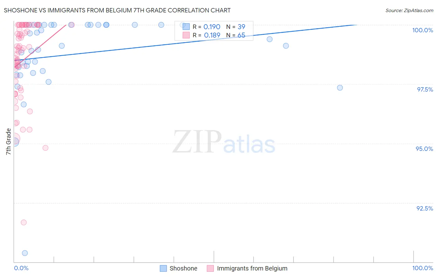In terms of 7th grade, the demographic groups most similar to Shoshone are South African (96.6%, a difference of 0.010%), Immigrants from Czechoslovakia (96.6%, a difference of 0.020%), Immigrants from Singapore (96.6%, a difference of 0.020%), Thai (96.7%, a difference of 0.040%), and Immigrants from Sweden (96.7%, a difference of 0.050%). Similarly, the demographic groups most similar to Immigrants from Belgium are Puget Sound Salish (96.7%, a difference of 0.0%), Cree (96.7%, a difference of 0.0%), Turkish (96.7%, a difference of 0.010%), Immigrants from South Africa (96.7%, a difference of 0.010%), and Osage (96.7%, a difference of 0.010%).