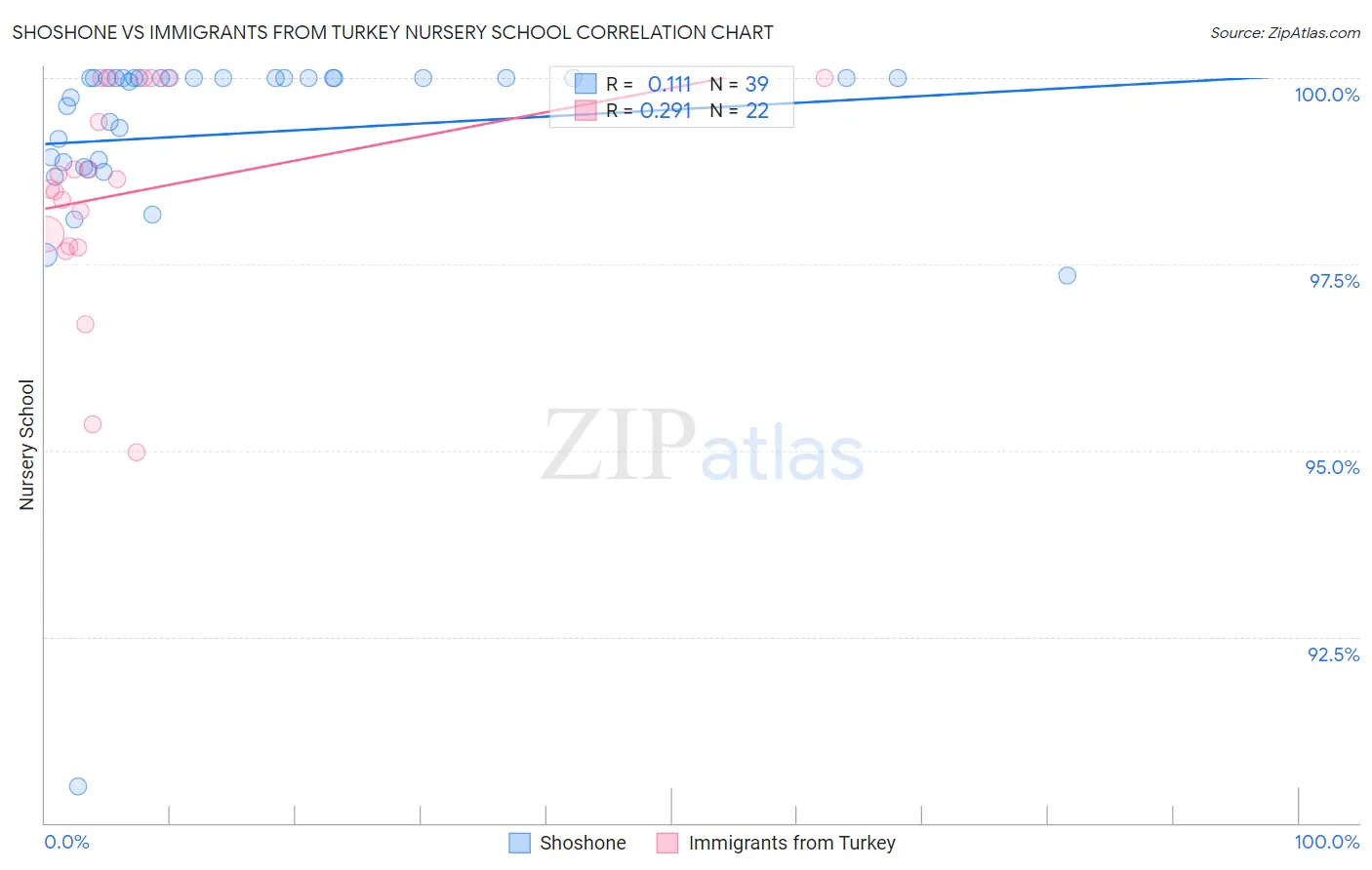 Shoshone vs Immigrants from Turkey Nursery School Correlation Chart