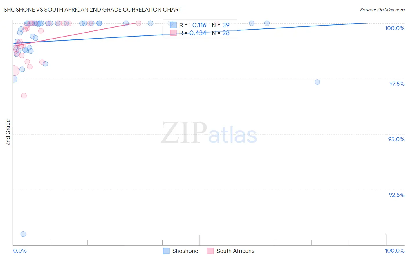 In terms of 2nd grade, the demographic groups most similar to Shoshone are Cherokee (98.3%, a difference of 0.0%), Immigrants from England (98.3%, a difference of 0.0%), Immigrants from Lithuania (98.2%, a difference of 0.010%), Immigrants from Belgium (98.2%, a difference of 0.010%), and Osage (98.2%, a difference of 0.010%). Similarly, the demographic groups most similar to South Africans are Immigrants from Germany (98.2%, a difference of 0.0%), Immigrants from India (98.2%, a difference of 0.010%), Ukrainian (98.2%, a difference of 0.020%), Zimbabwean (98.2%, a difference of 0.020%), and Immigrants from Western Europe (98.2%, a difference of 0.020%).