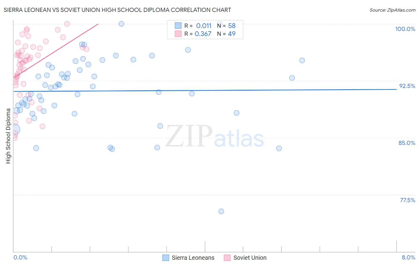The statistical analysis conducted on geographies consisting of 83,355,497 people shows no correlation between the proportion of Sierra Leoneans and percentage of population with at least high school diploma education in the United States with a correlation coefficient (R) of 0.011 and weighted average of 89.1%. Similarly, the statistical analysis conducted on geographies consisting of 43,454,395 people shows a mild positive correlation between the proportion of Soviet Union and percentage of population with at least high school diploma education in the United States with a correlation coefficient (R) of 0.367 and weighted average of 90.9%, a difference of 2.0%.