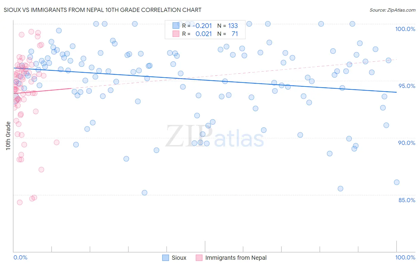 Sioux vs Immigrants from Nepal 10th Grade Correlation Chart