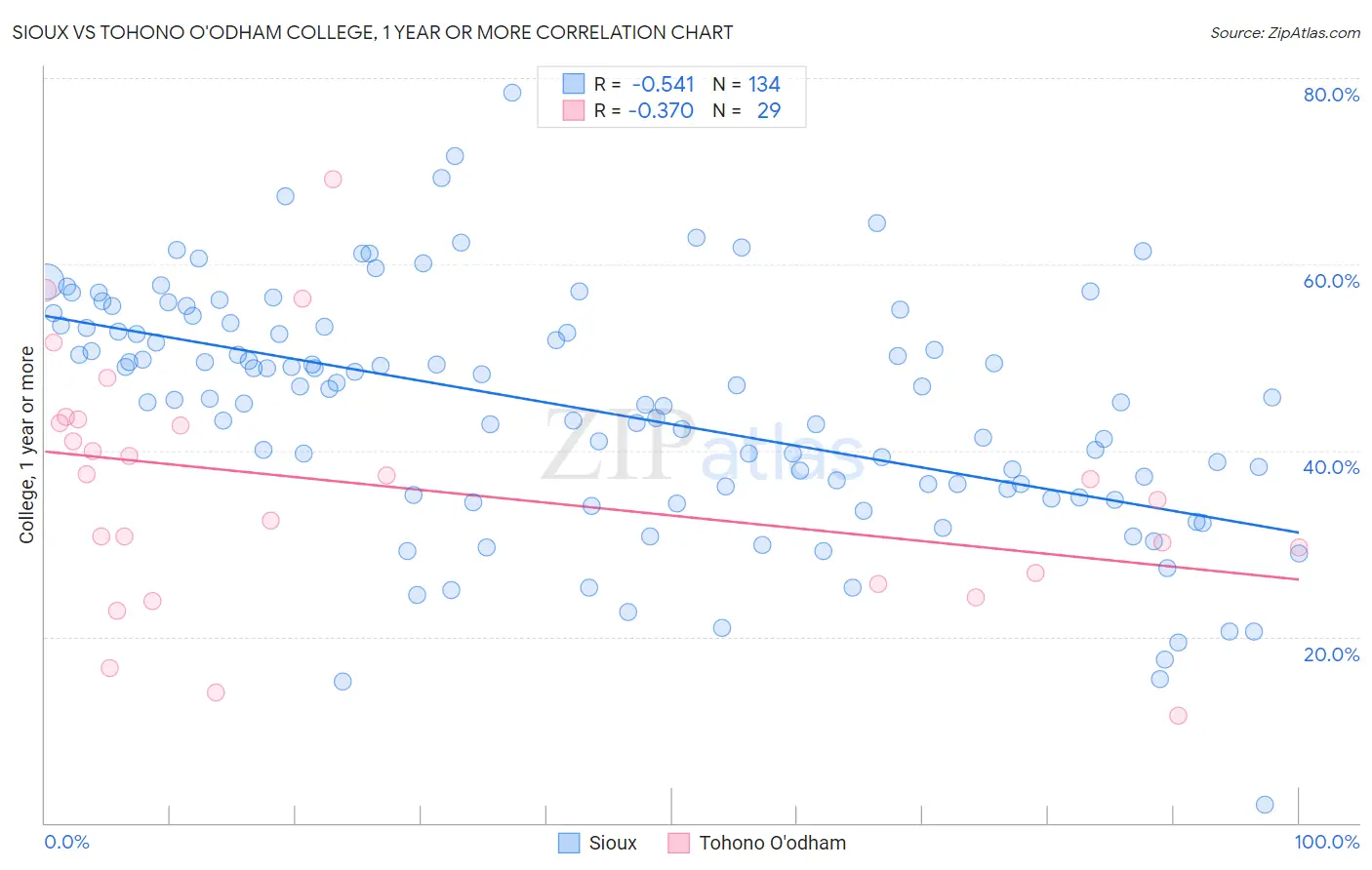 Sioux vs Tohono O'odham College, 1 year or more Correlation Chart