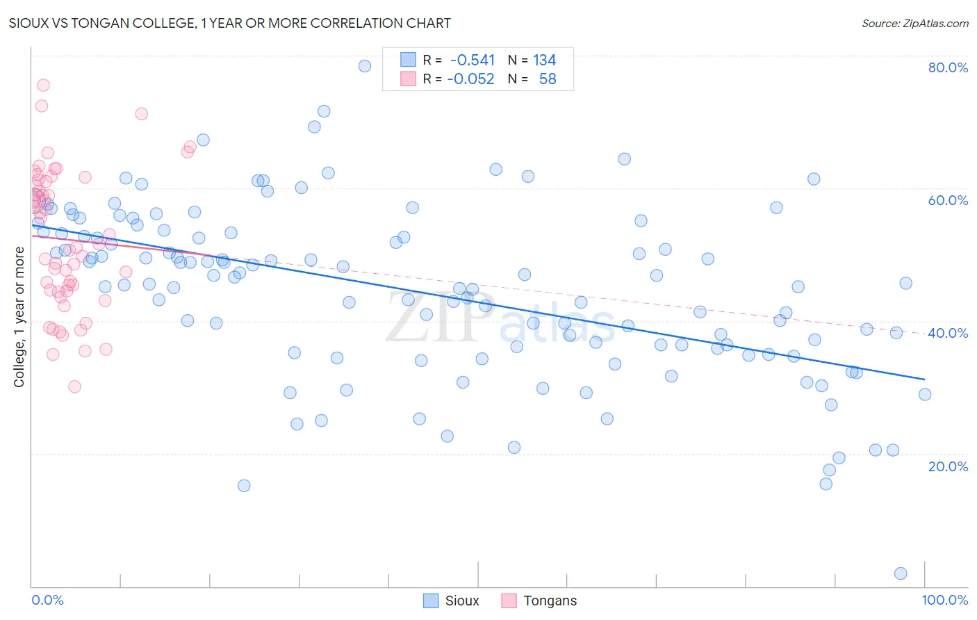 The statistical analysis conducted on geographies consisting of 234,199,467 people shows a substantial negative correlation between the proportion of Sioux and percentage of population with at least college, 1 year or more education in the United States with a correlation coefficient (R) of -0.541 and weighted average of 53.0%. Similarly, the statistical analysis conducted on geographies consisting of 102,908,759 people shows a slight negative correlation between the proportion of Tongans and percentage of population with at least college, 1 year or more education in the United States with a correlation coefficient (R) of -0.052 and weighted average of 57.8%, a difference of 9.1%.