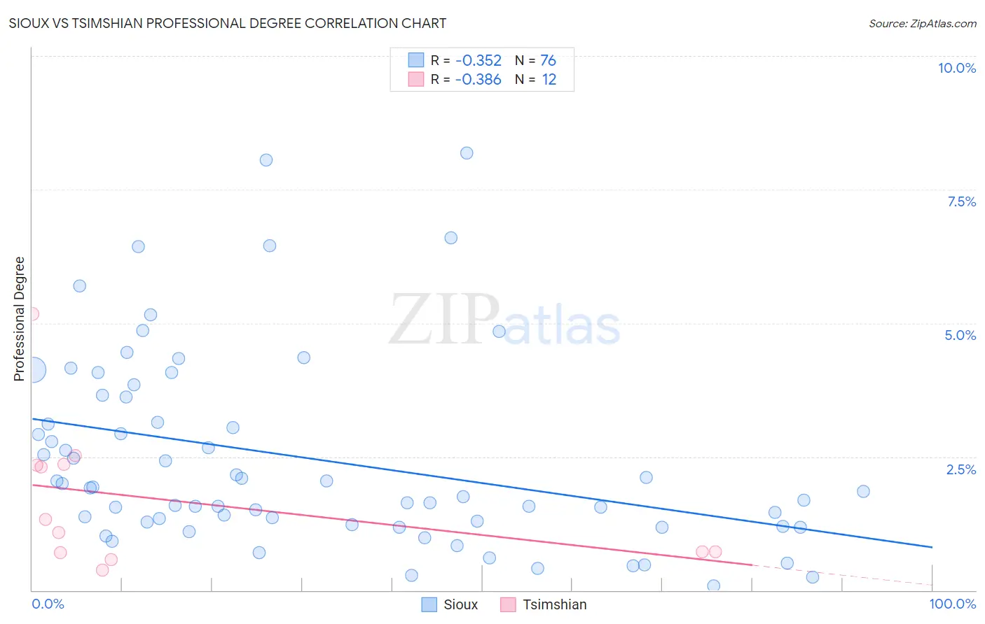 The statistical analysis conducted on geographies consisting of 233,329,443 people shows a mild negative correlation between the proportion of Sioux and percentage of population with at least professional degree education in the United States with a correlation coefficient (R) of -0.352 and weighted average of 3.3%. Similarly, the statistical analysis conducted on geographies consisting of 15,614,727 people shows a mild negative correlation between the proportion of Tsimshian and percentage of population with at least professional degree education in the United States with a correlation coefficient (R) of -0.386 and weighted average of 3.2%, a difference of 2.9%.