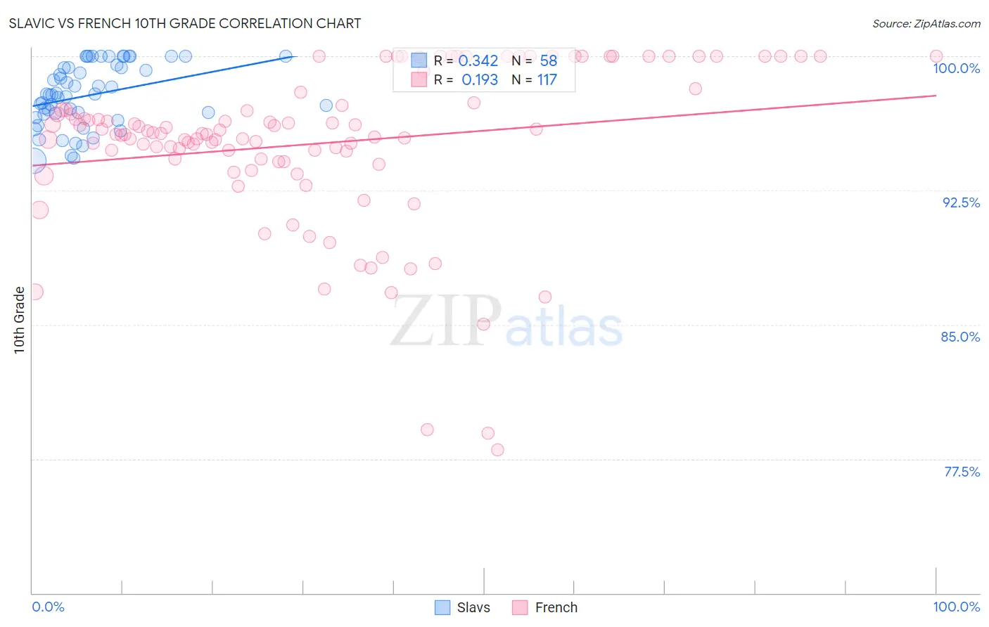 In terms of 10th grade, the demographic groups most similar to Slavs are Macedonian (95.2%, a difference of 0.020%), Russian (95.2%, a difference of 0.030%), Immigrants from Northern Europe (95.2%, a difference of 0.030%), Greek (95.2%, a difference of 0.030%), and Czechoslovakian (95.1%, a difference of 0.040%). Similarly, the demographic groups most similar to French are Iranian (95.3%, a difference of 0.0%), Hungarian (95.3%, a difference of 0.0%), British (95.3%, a difference of 0.010%), Estonian (95.3%, a difference of 0.020%), and Immigrants from India (95.3%, a difference of 0.020%).