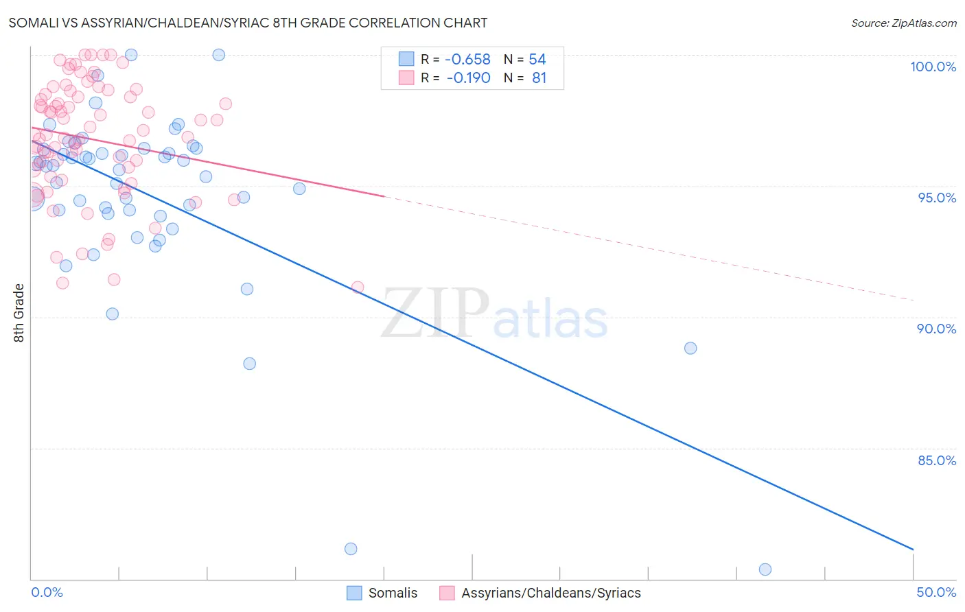 The statistical analysis conducted on geographies consisting of 99,332,457 people shows a significant negative correlation between the proportion of Somalis and percentage of population with at least 8th grade education in the United States with a correlation coefficient (R) of -0.658 and weighted average of 95.1%. Similarly, the statistical analysis conducted on geographies consisting of 110,318,304 people shows a poor negative correlation between the proportion of Assyrians/Chaldeans/Syriacs and percentage of population with at least 8th grade education in the United States with a correlation coefficient (R) of -0.190 and weighted average of 95.6%, a difference of 0.51%.