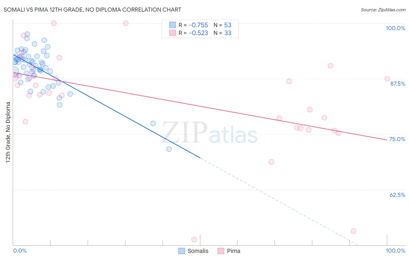 Somali vs Pima 12th Grade, No Diploma Correlation Chart