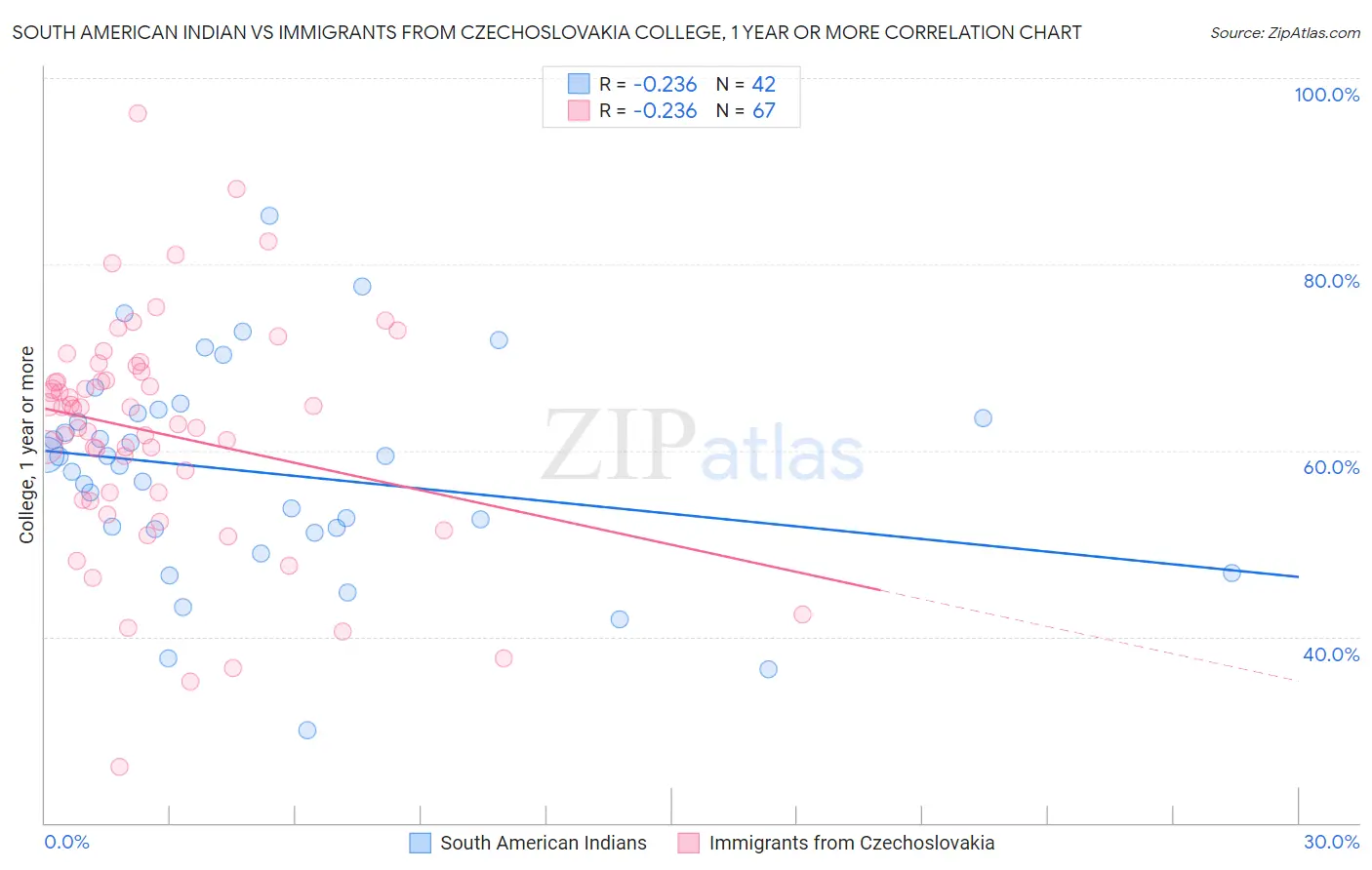 South American Indian vs Immigrants from Czechoslovakia College, 1 year or more Correlation Chart