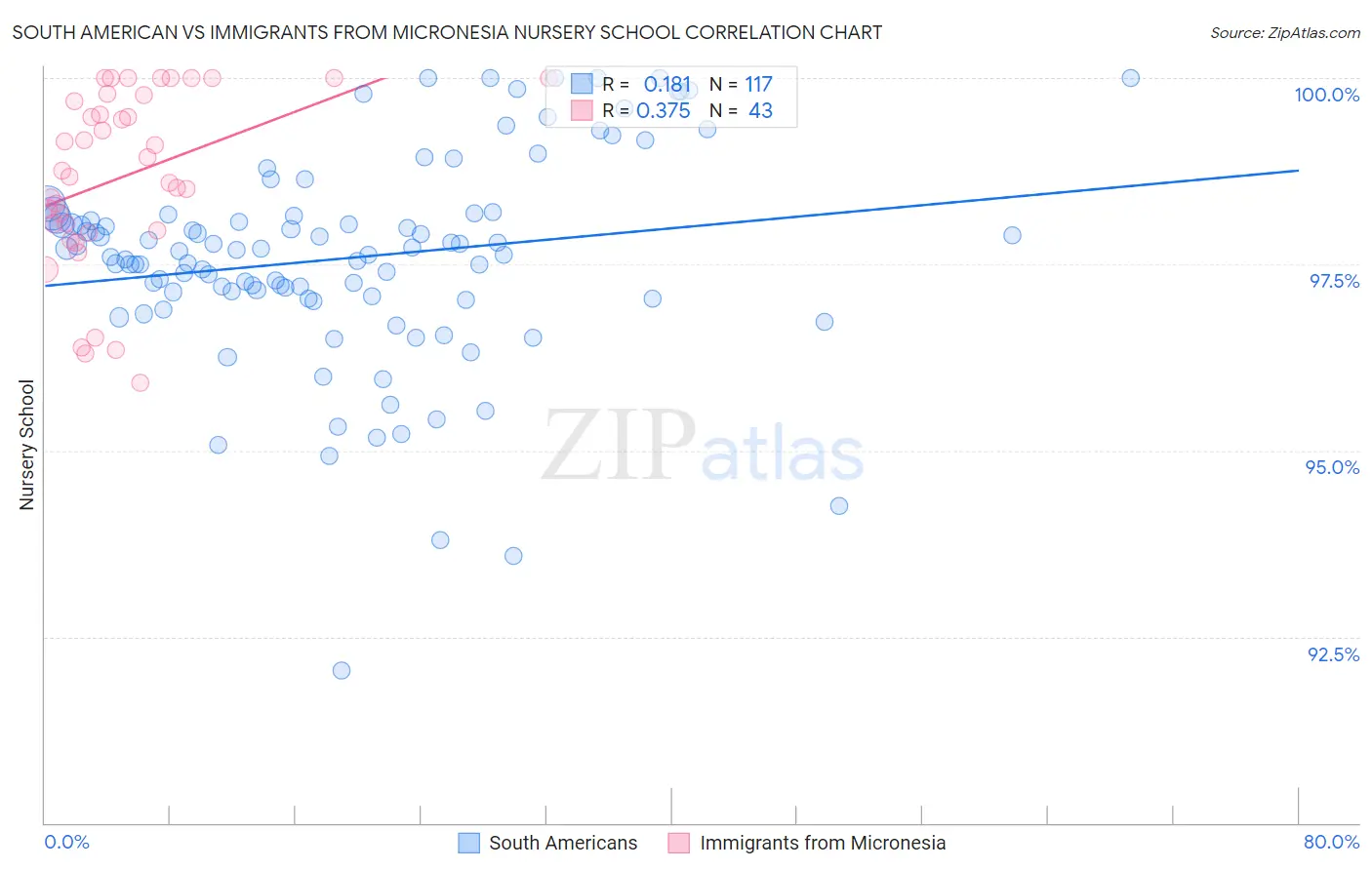 South American vs Immigrants from Micronesia Nursery School Correlation Chart