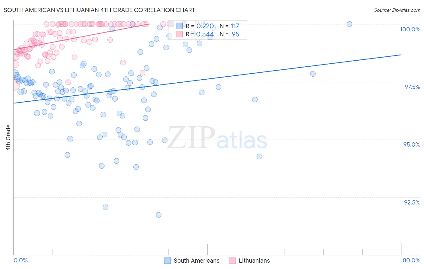 In terms of 4th grade, the demographic groups most similar to Lithuanians are Finnish (98.3%, a difference of 0.0%), Irish (98.4%, a difference of 0.010%), Alaska Native (98.4%, a difference of 0.010%), Polish (98.4%, a difference of 0.020%), and Sioux (98.3%, a difference of 0.020%).