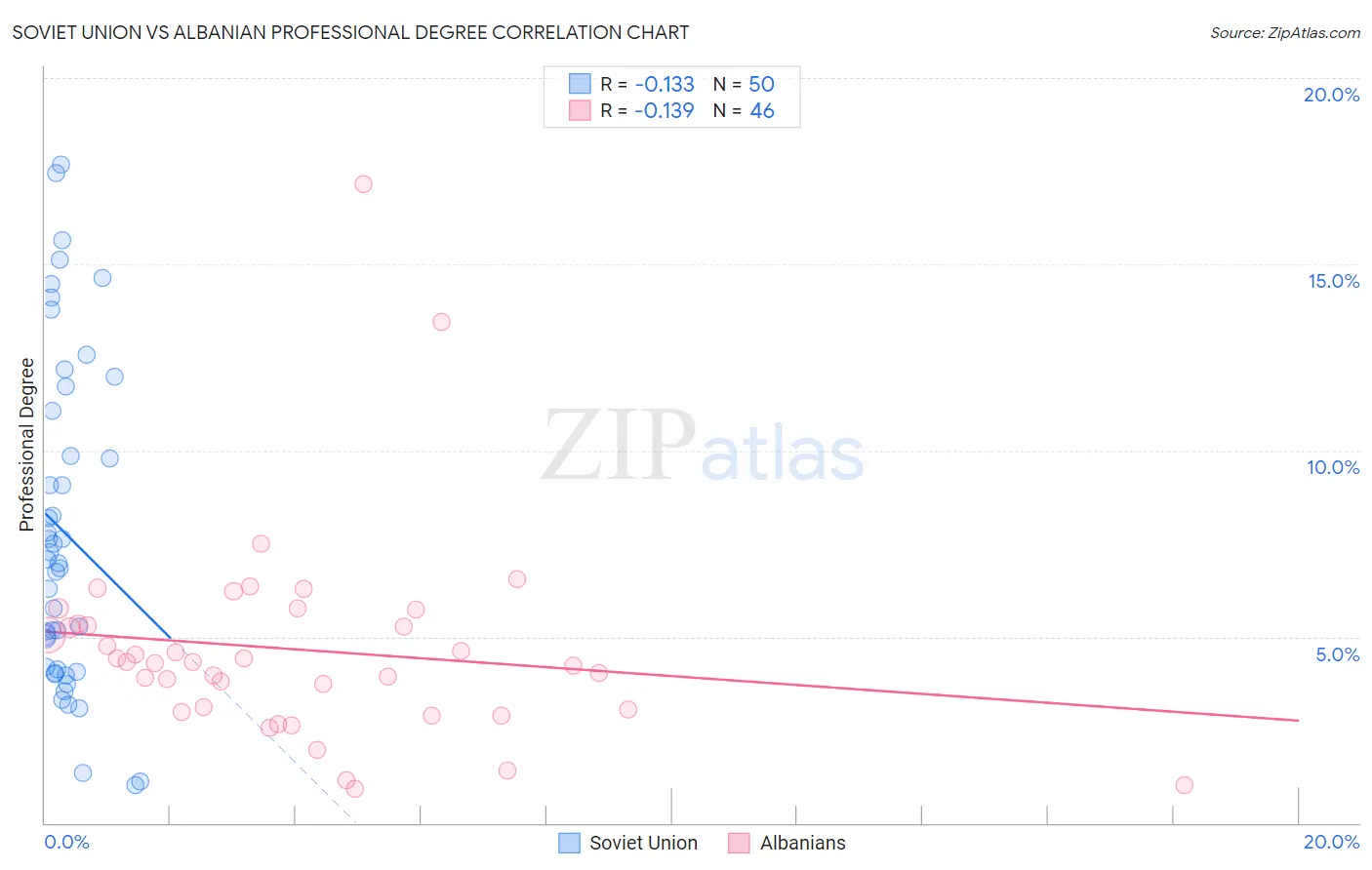 The statistical analysis conducted on geographies consisting of 43,509,630 people shows a poor negative correlation between the proportion of Soviet Union and percentage of population with at least professional degree education in the United States with a correlation coefficient (R) of -0.133 and weighted average of 6.6%. Similarly, the statistical analysis conducted on geographies consisting of 193,107,529 people shows a poor negative correlation between the proportion of Albanians and percentage of population with at least professional degree education in the United States with a correlation coefficient (R) of -0.139 and weighted average of 4.9%, a difference of 34.3%.