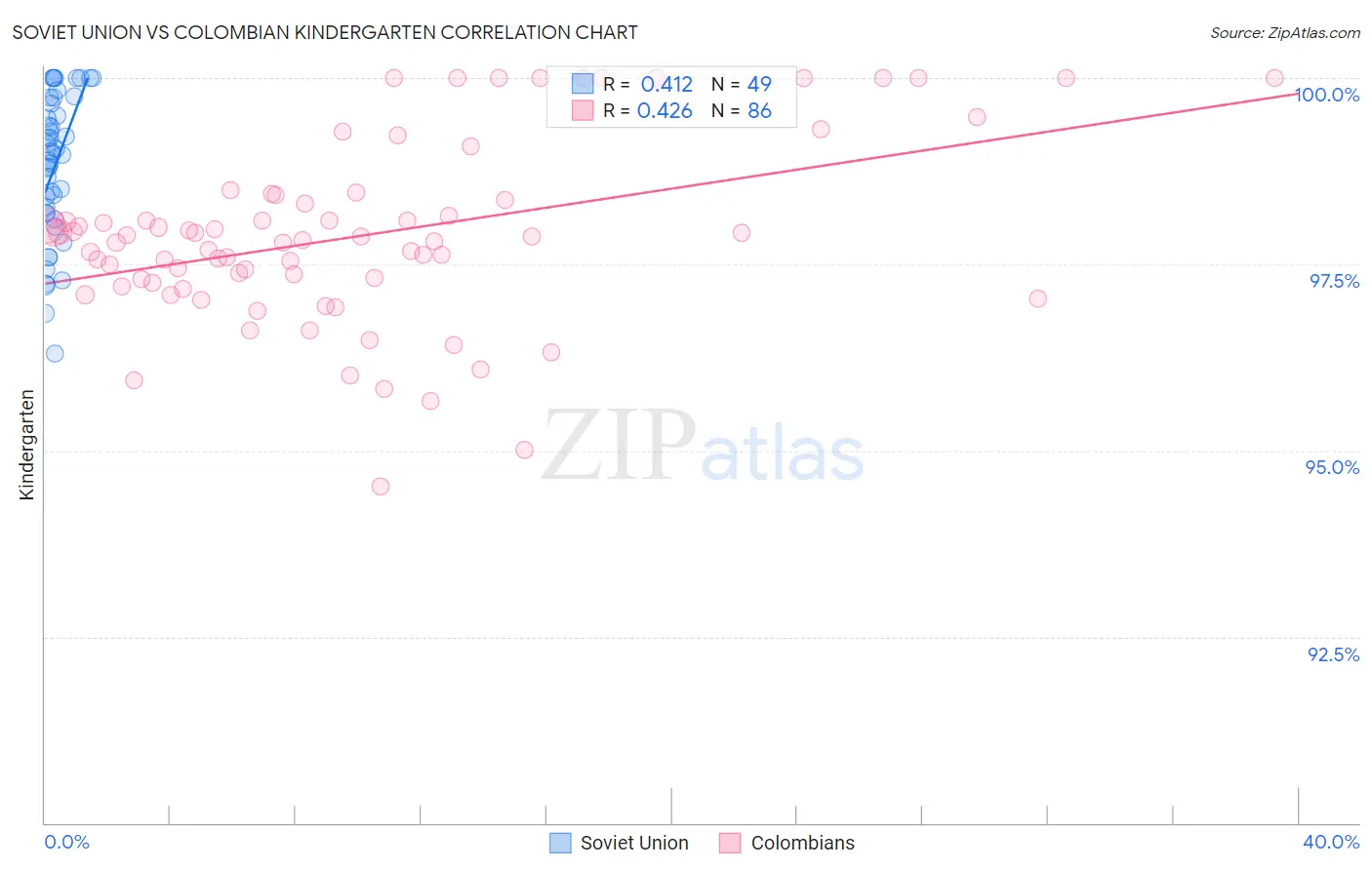 In terms of kindergarten, the demographic groups most similar to Soviet Union are Dutch West Indian (98.0%, a difference of 0.0%), Jordanian (98.0%, a difference of 0.010%), Immigrants from Moldova (98.0%, a difference of 0.010%), Immigrants from Iran (98.0%, a difference of 0.010%), and Comanche (98.0%, a difference of 0.010%).