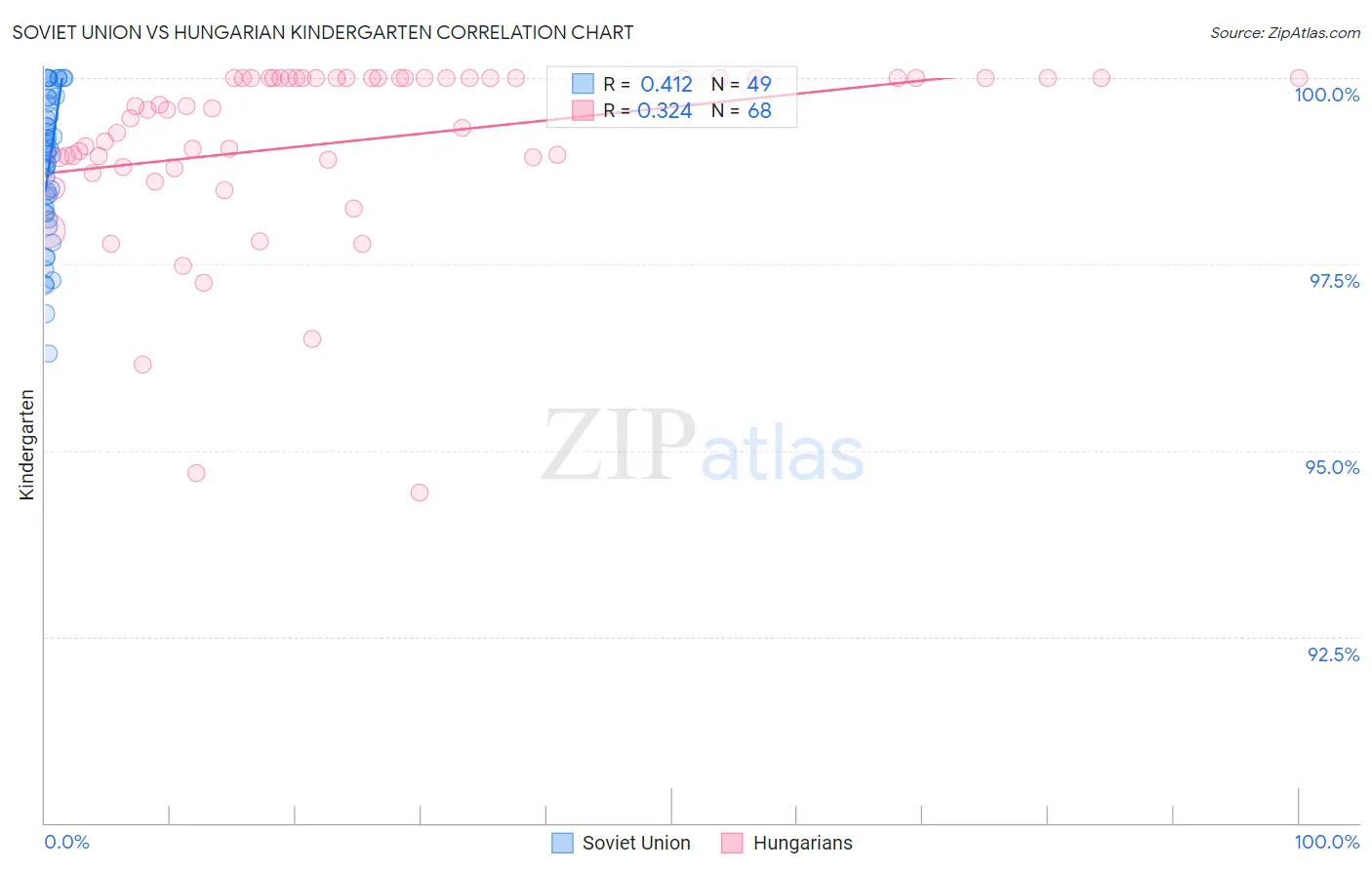 In terms of kindergarten, the demographic groups most similar to Soviet Union are Dutch West Indian (98.0%, a difference of 0.0%), Jordanian (98.0%, a difference of 0.010%), Immigrants from Moldova (98.0%, a difference of 0.010%), Immigrants from Iran (98.0%, a difference of 0.010%), and Comanche (98.0%, a difference of 0.010%).