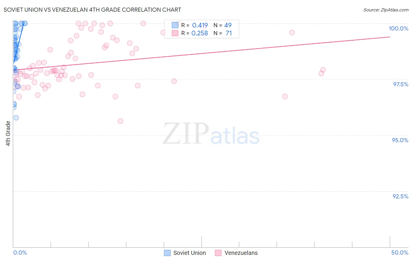 In terms of 4th grade, the demographic groups most similar to Soviet Union are Immigrants from Israel (97.6%, a difference of 0.0%), Alsatian (97.6%, a difference of 0.0%), Immigrants from South Central Asia (97.6%, a difference of 0.010%), Ute (97.7%, a difference of 0.020%), and Hopi (97.7%, a difference of 0.020%). Similarly, the demographic groups most similar to Venezuelans are Ugandan (97.6%, a difference of 0.0%), Apache (97.6%, a difference of 0.010%), Marshallese (97.6%, a difference of 0.010%), Bermudan (97.6%, a difference of 0.010%), and Immigrants from Iran (97.6%, a difference of 0.010%).