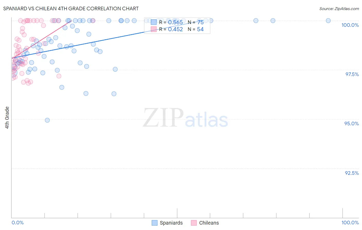 In terms of 4th grade, the demographic groups most similar to Chileans are Kenyan (97.5%, a difference of 0.010%), Immigrants from Poland (97.5%, a difference of 0.010%), Immigrants from Belarus (97.5%, a difference of 0.010%), Immigrants from Spain (97.5%, a difference of 0.010%), and Brazilian (97.5%, a difference of 0.010%).