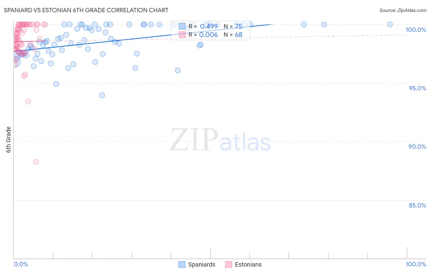 In terms of 6th grade, the demographic groups most similar to Estonians are Native Hawaiian (97.8%, a difference of 0.0%), Celtic (97.8%, a difference of 0.0%), Immigrants from Scotland (97.8%, a difference of 0.0%), Arapaho (97.8%, a difference of 0.010%), and Maltese (97.8%, a difference of 0.010%).