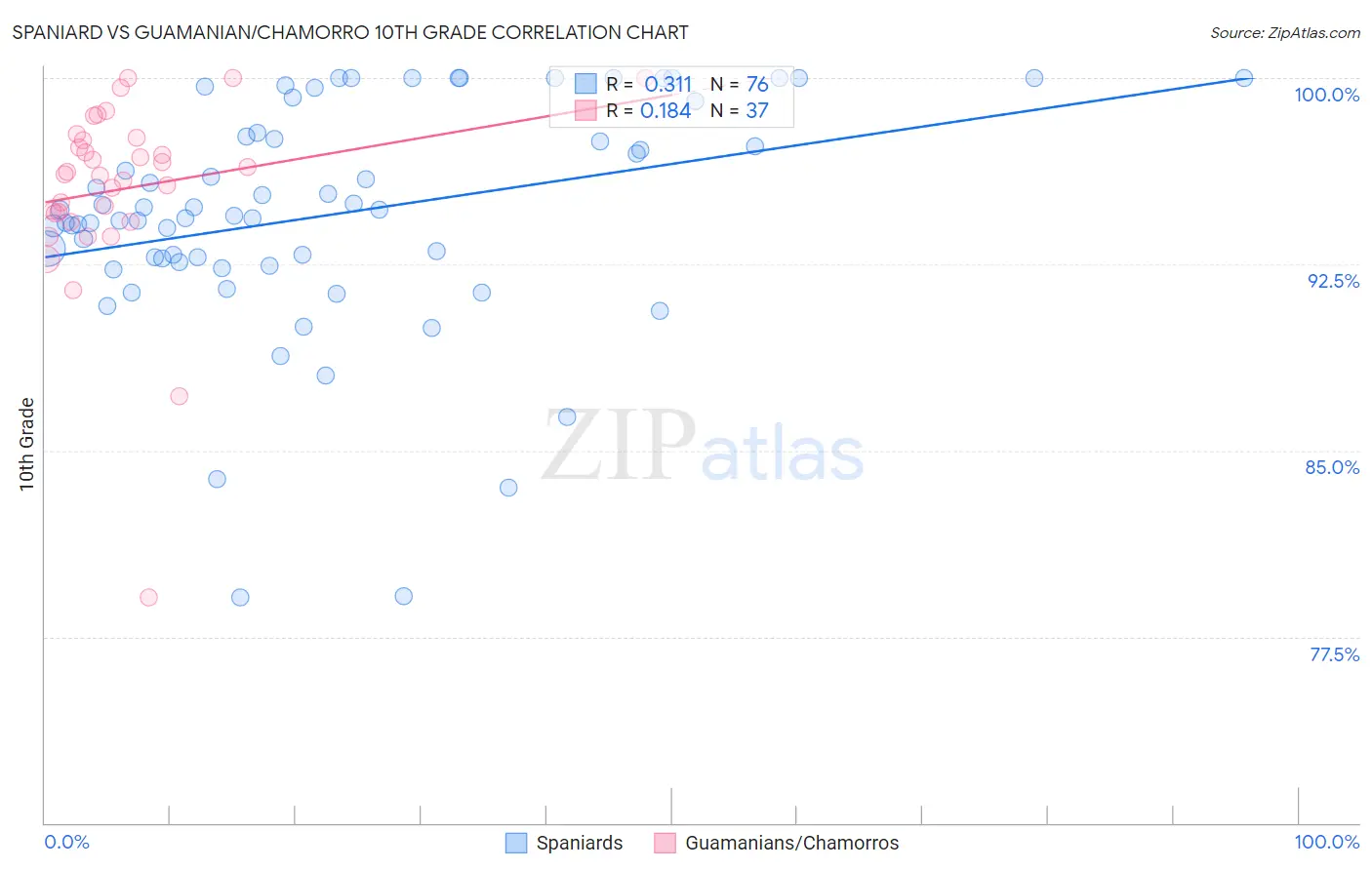 In terms of 10th grade, the demographic groups most similar to Spaniards are Argentinean (93.7%, a difference of 0.0%), French American Indian (93.7%, a difference of 0.010%), Immigrants from Nepal (93.7%, a difference of 0.010%), Immigrants from Albania (93.8%, a difference of 0.020%), and Immigrants from Venezuela (93.8%, a difference of 0.030%). Similarly, the demographic groups most similar to Guamanians/Chamorros are Choctaw (93.6%, a difference of 0.0%), Sudanese (93.6%, a difference of 0.0%), Colville (93.6%, a difference of 0.020%), Immigrants from Eastern Asia (93.6%, a difference of 0.020%), and Liberian (93.6%, a difference of 0.020%).