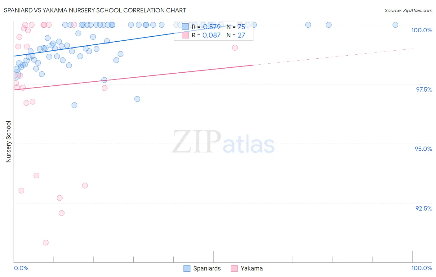 The statistical analysis conducted on geographies consisting of 443,544,503 people shows a substantial positive correlation between the proportion of Spaniards and percentage of population with at least nursery school education in the United States with a correlation coefficient (R) of 0.579 and weighted average of 98.2%. Similarly, the statistical analysis conducted on geographies consisting of 19,923,144 people shows a slight positive correlation between the proportion of Yakama and percentage of population with at least nursery school education in the United States with a correlation coefficient (R) of 0.087 and weighted average of 96.6%, a difference of 1.6%.