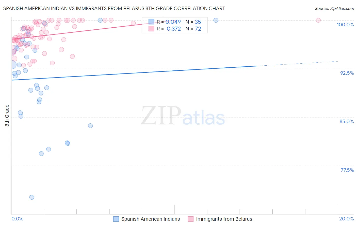 Spanish American Indian vs Immigrants from Belarus 8th Grade Correlation Chart