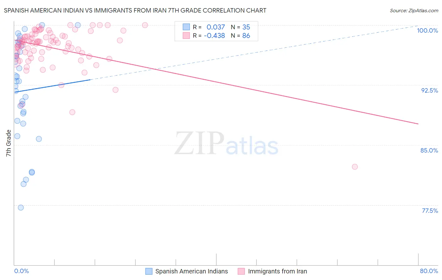 Spanish American Indian vs Immigrants from Iran 7th Grade Correlation Chart