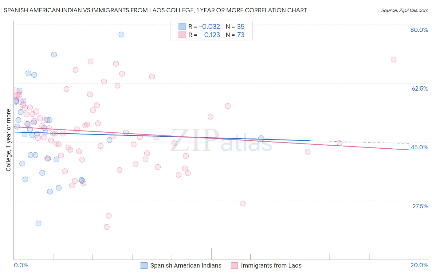Spanish American Indian vs Immigrants from Laos College, 1 year or more Correlation Chart