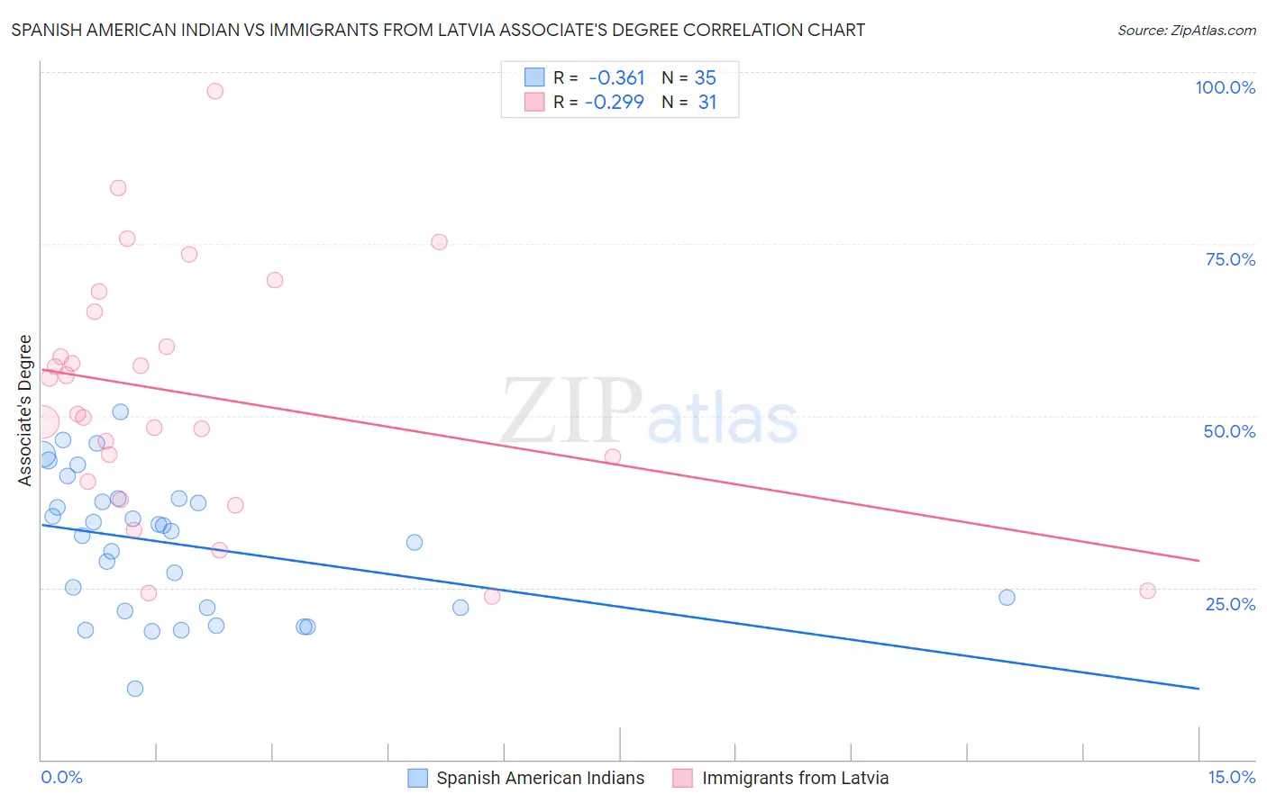 Spanish American Indian vs Immigrants from Latvia Associate's Degree Correlation Chart