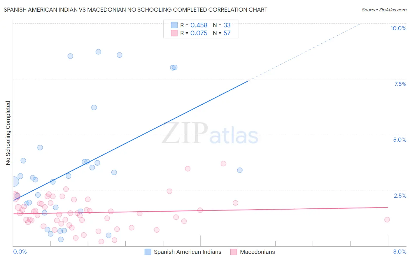 Spanish American Indian vs Macedonian No Schooling Completed Correlation Chart