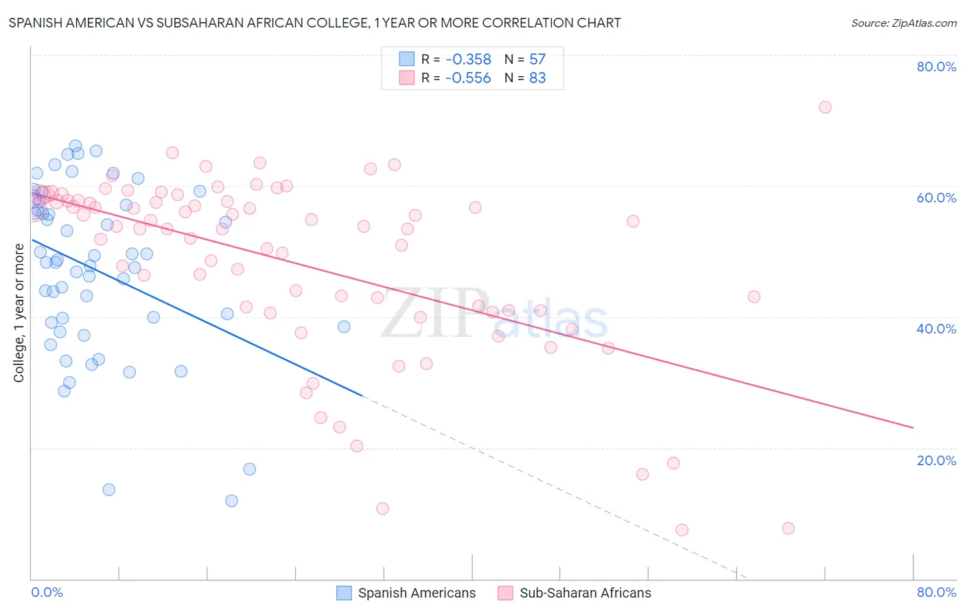 In terms of college, 1 year or more, the demographic groups most similar to Spanish Americans are West Indian (56.3%, a difference of 0.0%), Iroquois (56.2%, a difference of 0.050%), Samoan (56.2%, a difference of 0.16%), Barbadian (56.0%, a difference of 0.43%), and Nonimmigrants (56.5%, a difference of 0.45%). Similarly, the demographic groups most similar to Sub-Saharan Africans are Portuguese (57.2%, a difference of 0.17%), Hmong (57.2%, a difference of 0.17%), Immigrants from Ghana (57.4%, a difference of 0.34%), Vietnamese (57.0%, a difference of 0.38%), and Immigrants from Western Africa (57.0%, a difference of 0.40%).