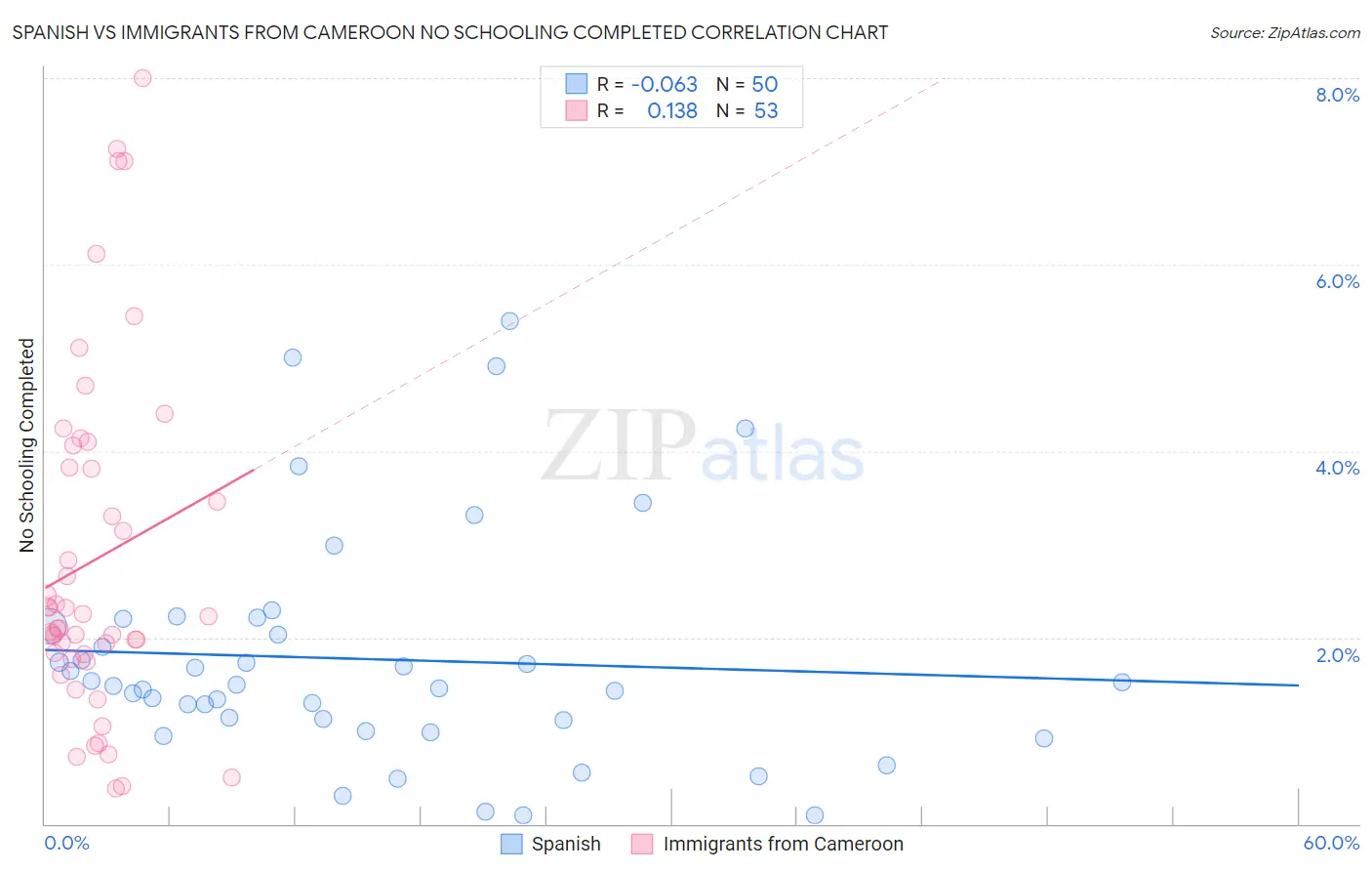 Spanish vs Immigrants from Cameroon No Schooling Completed Correlation Chart