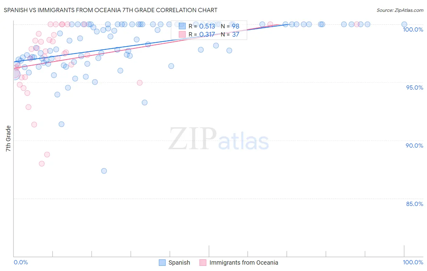 Spanish vs Immigrants from Oceania 7th Grade Correlation Chart