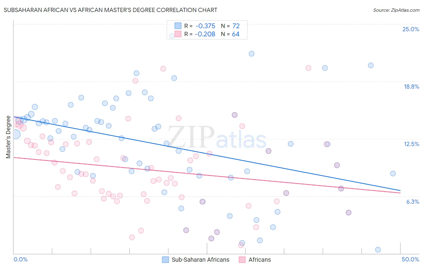 The statistical analysis conducted on geographies consisting of 507,799,388 people shows a mild negative correlation between the proportion of Sub-Saharan Africans and percentage of population with at least master's degree education in the United States with a correlation coefficient (R) of -0.375 and weighted average of 14.2%. Similarly, the statistical analysis conducted on geographies consisting of 469,751,464 people shows a weak negative correlation between the proportion of Africans and percentage of population with at least master's degree education in the United States with a correlation coefficient (R) of -0.208 and weighted average of 12.9%, a difference of 10.5%.