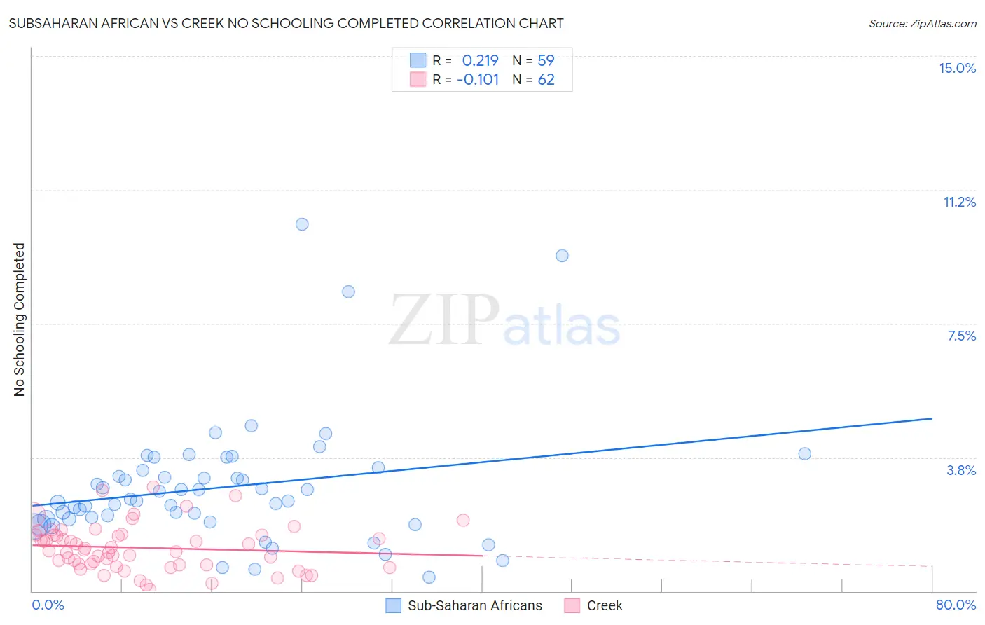 Subsaharan African vs Creek No Schooling Completed Correlation Chart