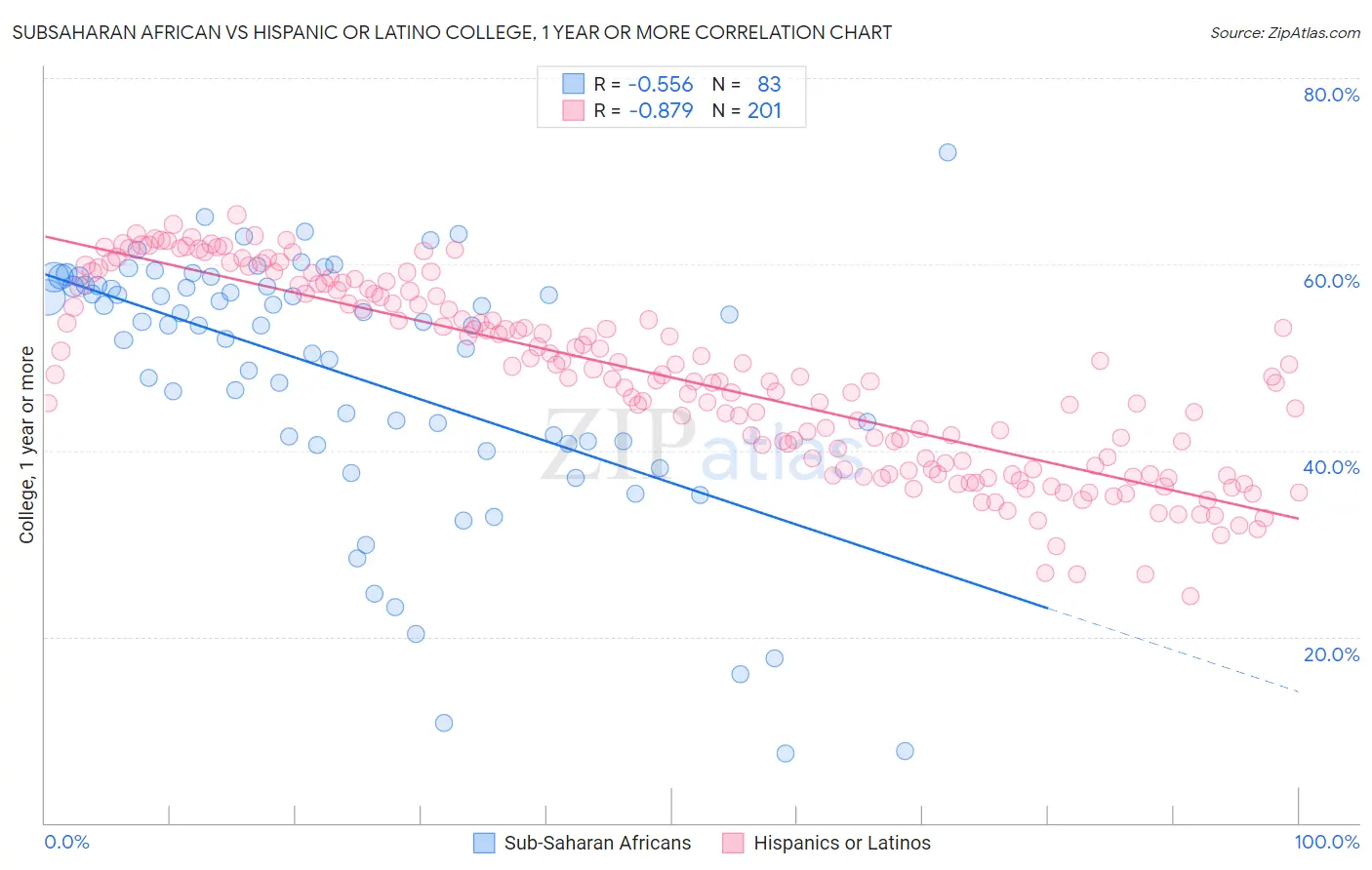 Subsaharan African vs Hispanic or Latino College, 1 year or more Correlation Chart