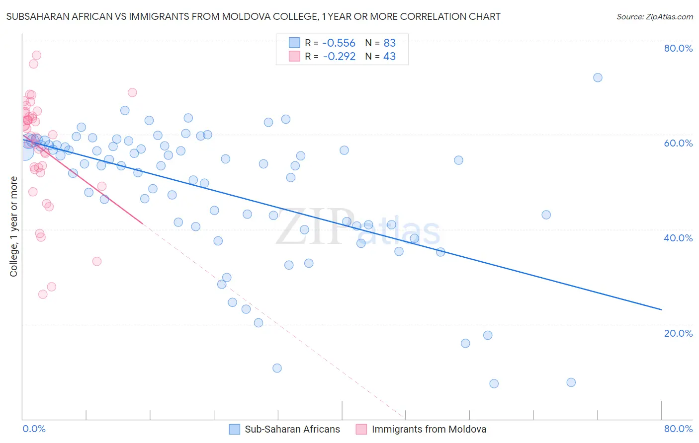 Subsaharan African vs Immigrants from Moldova College, 1 year or more Correlation Chart