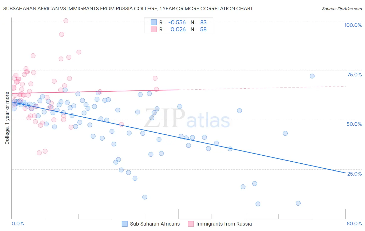 Subsaharan African vs Immigrants from Russia College, 1 year or more Correlation Chart
