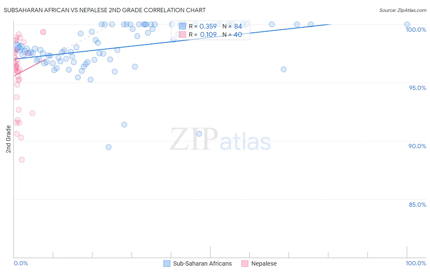 In terms of 2nd grade, the demographic groups most similar to Sub-Saharan Africans are Immigrants from Syria (97.6%, a difference of 0.010%), Immigrants from Nepal (97.6%, a difference of 0.010%), Immigrants from Costa Rica (97.6%, a difference of 0.010%), Senegalese (97.6%, a difference of 0.010%), and Iraqi (97.6%, a difference of 0.020%).