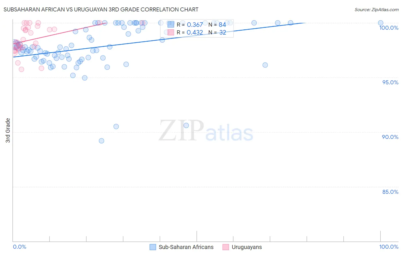 In terms of 3rd grade, the demographic groups most similar to Sub-Saharan Africans are Immigrants from Sudan (97.5%, a difference of 0.010%), Senegalese (97.5%, a difference of 0.010%), Immigrants from Pakistan (97.5%, a difference of 0.010%), Immigrants from Costa Rica (97.5%, a difference of 0.010%), and Sudanese (97.5%, a difference of 0.020%). Similarly, the demographic groups most similar to Uruguayans are Immigrants from Panama (97.5%, a difference of 0.0%), Immigrants from Morocco (97.5%, a difference of 0.0%), South American Indian (97.5%, a difference of 0.010%), Immigrants from Nepal (97.5%, a difference of 0.010%), and Sierra Leonean (97.5%, a difference of 0.010%).