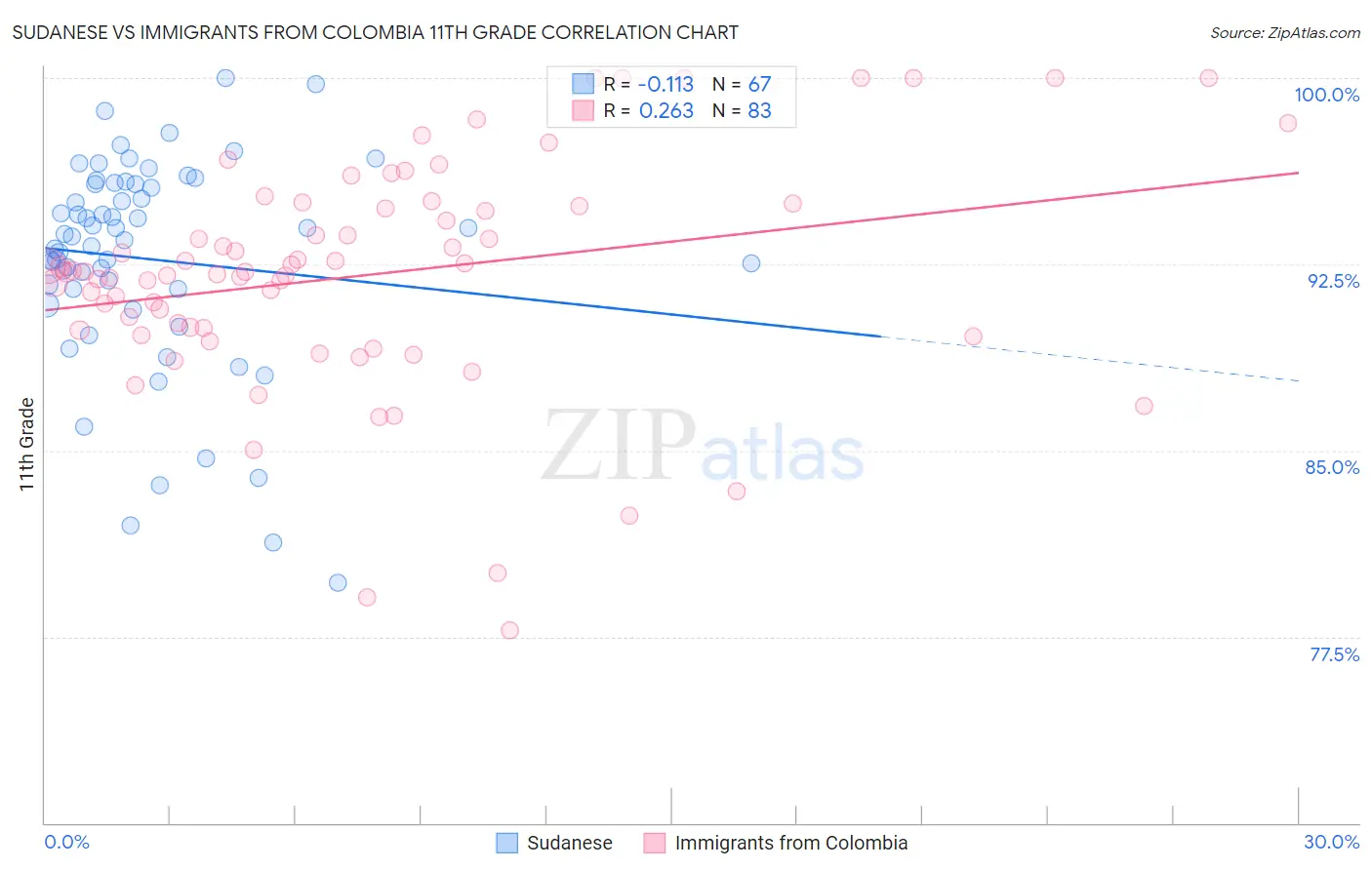 Sudanese vs Immigrants from Colombia 11th Grade Correlation Chart