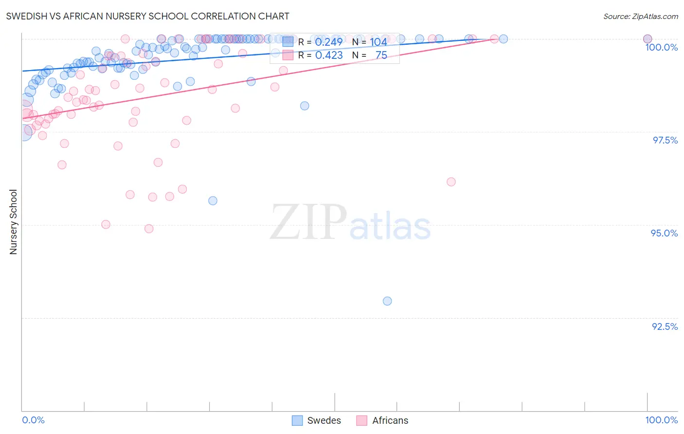 In terms of nursery school, the demographic groups most similar to Swedes are English (98.7%, a difference of 0.010%), Carpatho Rusyn (98.7%, a difference of 0.010%), Scottish (98.7%, a difference of 0.010%), Aleut (98.7%, a difference of 0.020%), and Dutch (98.7%, a difference of 0.020%).