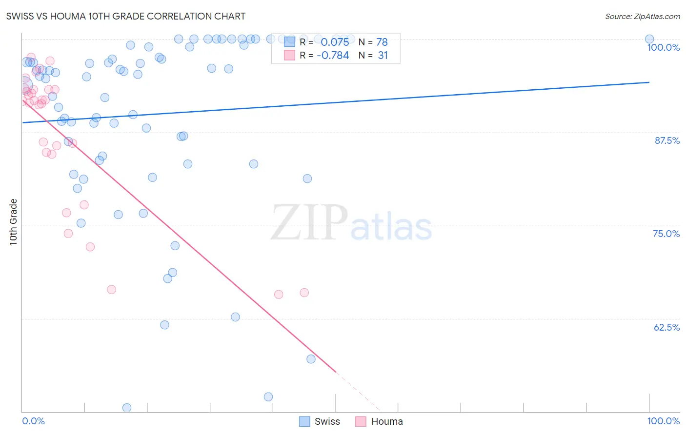 The statistical analysis conducted on geographies consisting of 465,022,572 people shows a slight positive correlation between the proportion of Swiss and percentage of population with at least 10th grade education in the United States with a correlation coefficient (R) of 0.075 and weighted average of 94.7%. Similarly, the statistical analysis conducted on geographies consisting of 36,795,916 people shows a strong negative correlation between the proportion of Houma and percentage of population with at least 10th grade education in the United States with a correlation coefficient (R) of -0.784 and weighted average of 90.2%, a difference of 5.1%.