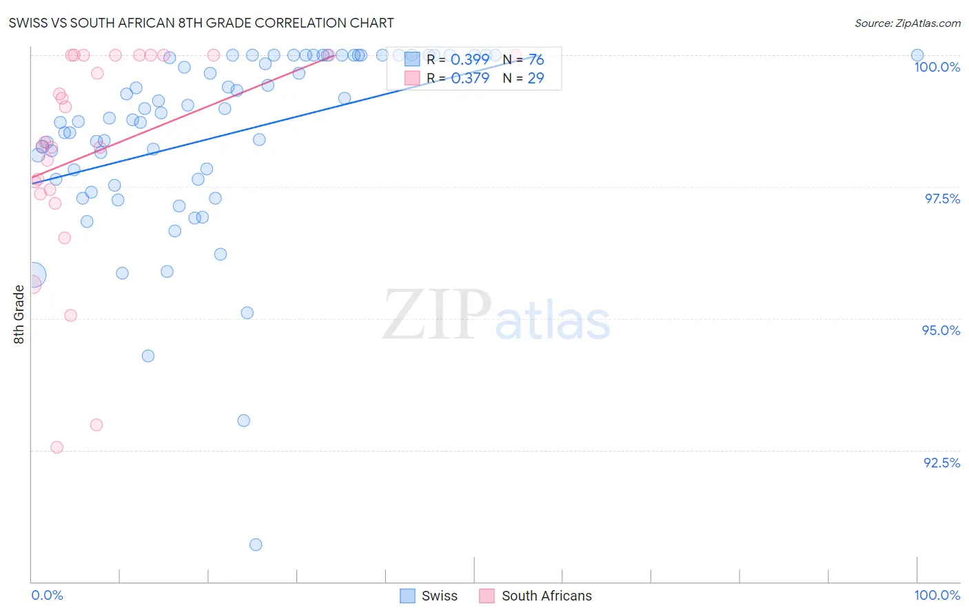 The statistical analysis conducted on geographies consisting of 465,021,856 people shows a mild positive correlation between the proportion of Swiss and percentage of population with at least 8th grade education in the United States with a correlation coefficient (R) of 0.399 and weighted average of 97.0%. Similarly, the statistical analysis conducted on geographies consisting of 182,604,532 people shows a mild positive correlation between the proportion of South Africans and percentage of population with at least 8th grade education in the United States with a correlation coefficient (R) of 0.379 and weighted average of 96.4%, a difference of 0.71%.
