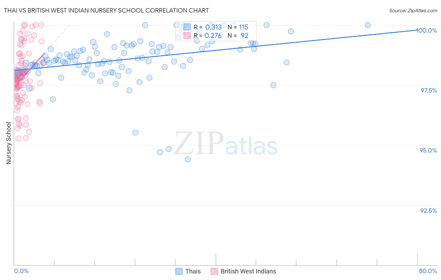 The statistical analysis conducted on geographies consisting of 475,866,115 people shows a mild positive correlation between the proportion of Thais and percentage of population with at least nursery school education in the United States with a correlation coefficient (R) of 0.313 and weighted average of 98.2%. Similarly, the statistical analysis conducted on geographies consisting of 152,691,173 people shows a weak positive correlation between the proportion of British West Indians and percentage of population with at least nursery school education in the United States with a correlation coefficient (R) of 0.276 and weighted average of 97.3%, a difference of 0.93%.