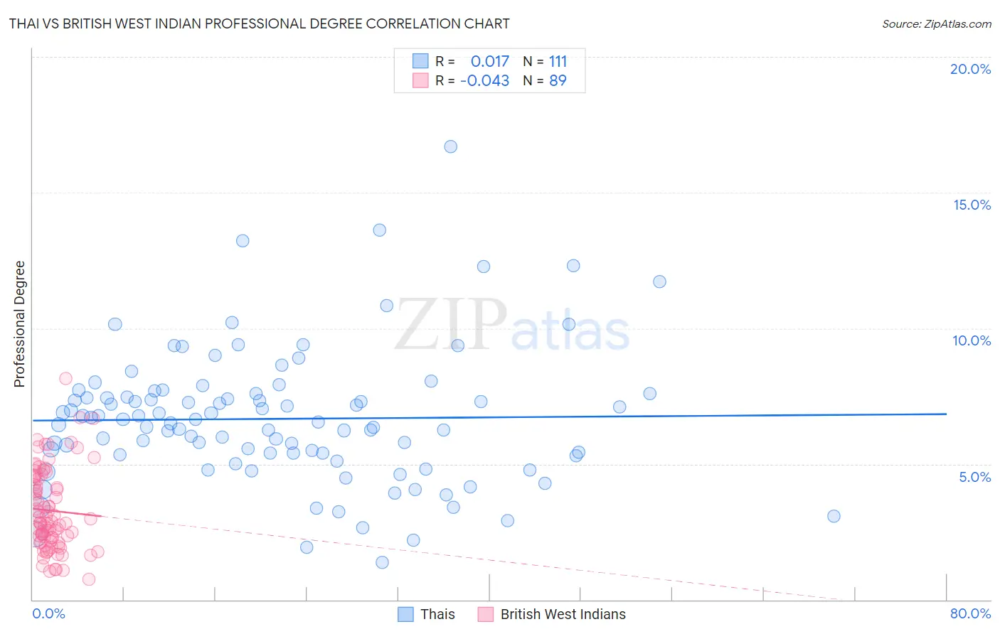 The statistical analysis conducted on geographies consisting of 474,458,456 people shows no correlation between the proportion of Thais and percentage of population with at least professional degree education in the United States with a correlation coefficient (R) of 0.017 and weighted average of 6.1%. Similarly, the statistical analysis conducted on geographies consisting of 152,575,254 people shows no correlation between the proportion of British West Indians and percentage of population with at least professional degree education in the United States with a correlation coefficient (R) of -0.043 and weighted average of 3.8%, a difference of 61.1%.