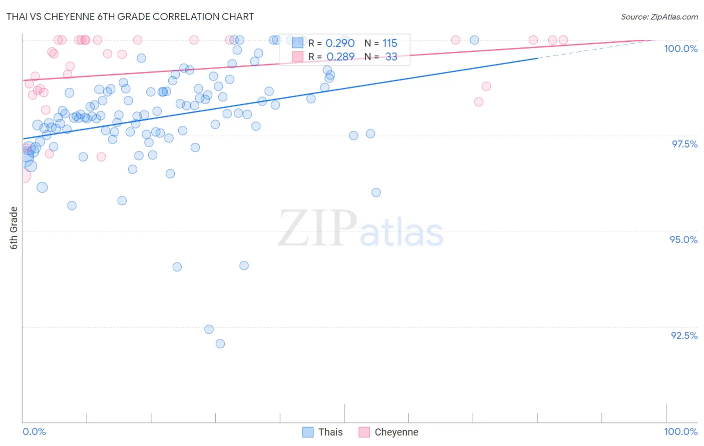 In terms of 6th grade, the demographic groups most similar to Thais are Iroquois (97.4%, a difference of 0.0%), Immigrants from Latvia (97.4%, a difference of 0.010%), Nonimmigrants (97.4%, a difference of 0.020%), Immigrants from Czechoslovakia (97.4%, a difference of 0.020%), and Immigrants from Saudi Arabia (97.4%, a difference of 0.020%). Similarly, the demographic groups most similar to Cheyenne are Bhutanese (97.5%, a difference of 0.0%), German Russian (97.5%, a difference of 0.0%), Choctaw (97.5%, a difference of 0.010%), Menominee (97.5%, a difference of 0.010%), and Turkish (97.5%, a difference of 0.020%).