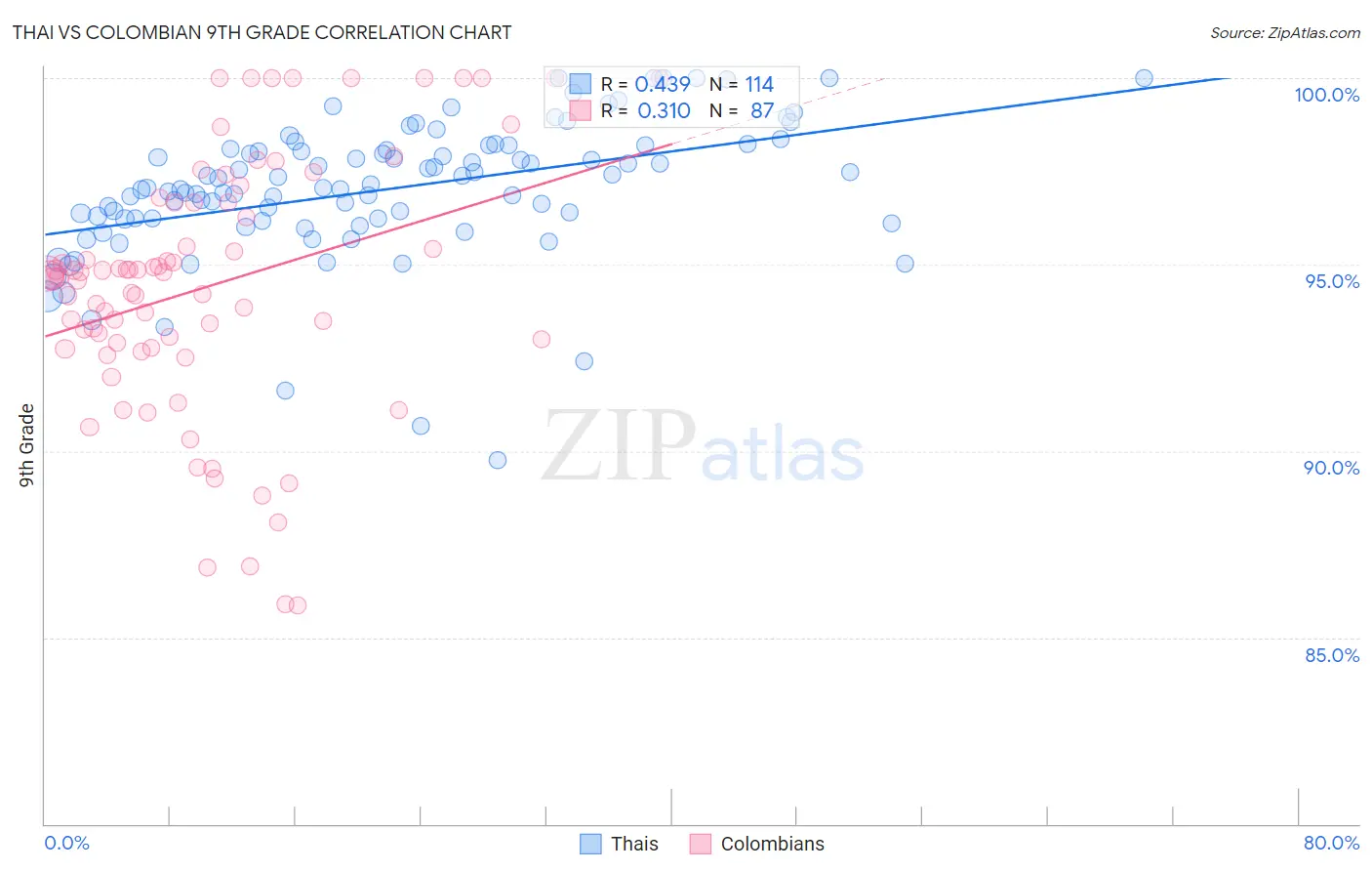 The statistical analysis conducted on geographies consisting of 475,814,962 people shows a moderate positive correlation between the proportion of Thais and percentage of population with at least 9th grade education in the United States with a correlation coefficient (R) of 0.439 and weighted average of 95.8%. Similarly, the statistical analysis conducted on geographies consisting of 419,655,116 people shows a mild positive correlation between the proportion of Colombians and percentage of population with at least 9th grade education in the United States with a correlation coefficient (R) of 0.310 and weighted average of 94.0%, a difference of 1.9%.