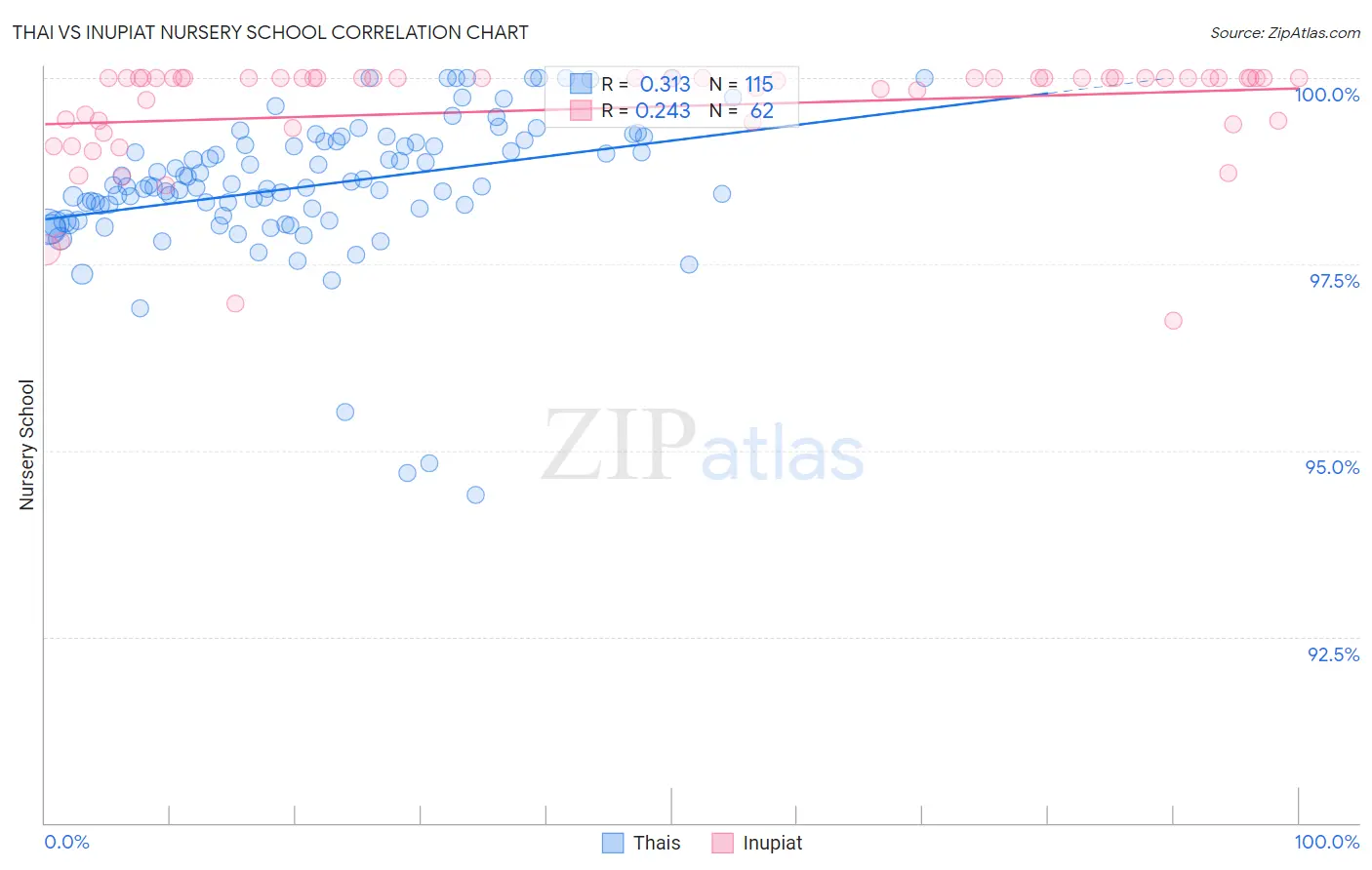 In terms of nursery school, the demographic groups most similar to Thais are Spanish (98.2%, a difference of 0.010%), Immigrants from France (98.2%, a difference of 0.010%), Yugoslavian (98.2%, a difference of 0.010%), Okinawan (98.2%, a difference of 0.010%), and Immigrants from Zimbabwe (98.2%, a difference of 0.010%).