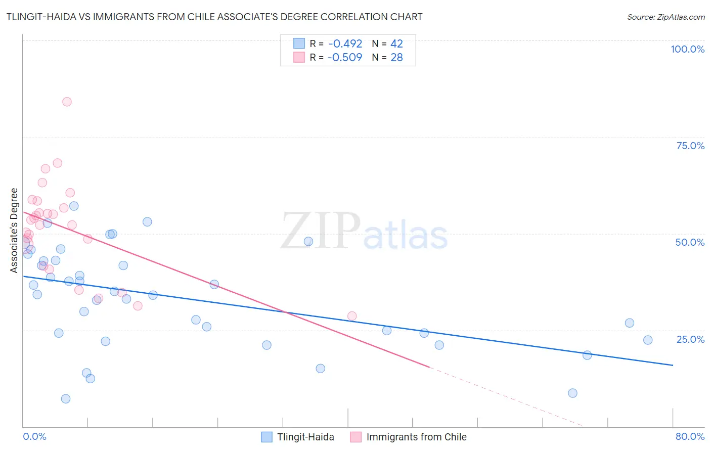 Tlingit-Haida vs Immigrants from Chile Associate's Degree Correlation Chart