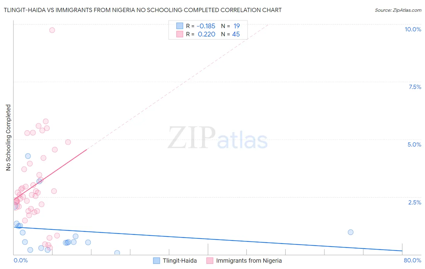 Tlingit-Haida vs Immigrants from Nigeria No Schooling Completed Correlation Chart